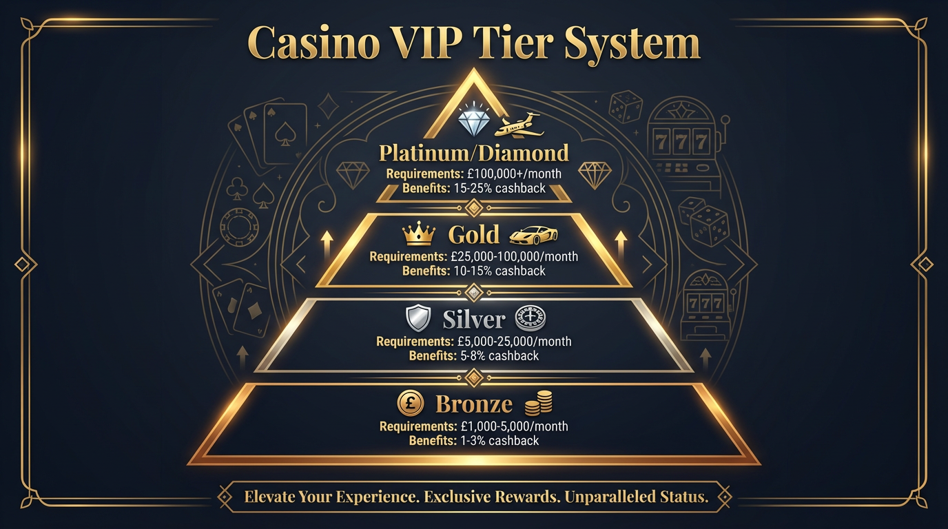 Important: These thresholds are approximate. Crypto casinos often have more generous tier structures, while traditional UK-licensed operators may have higher requirements. Always ask your host directly what's needed to reach the next level.